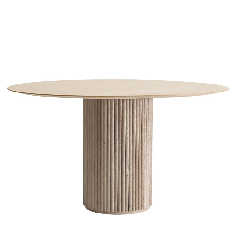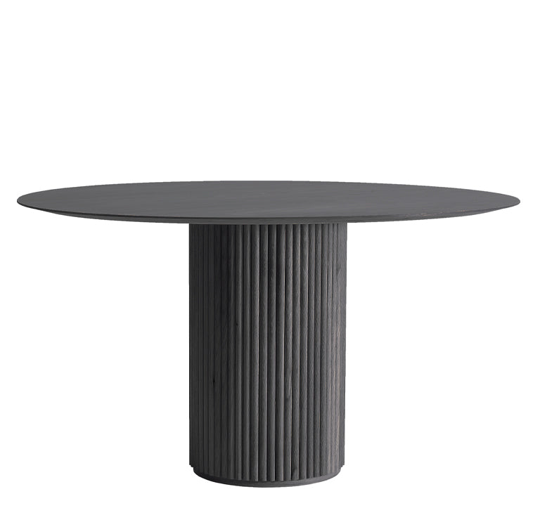 Round table with base in solid oak or ash panels. Top in veneer with a solid oak edge in the same color as the base. Available in multiple color options. The top is treated with polyurethane lacquer. Extra weight in the base for stability. Delivered with base and top separately.