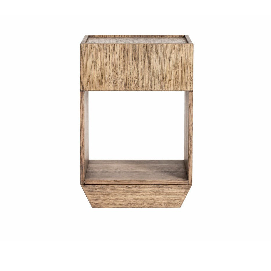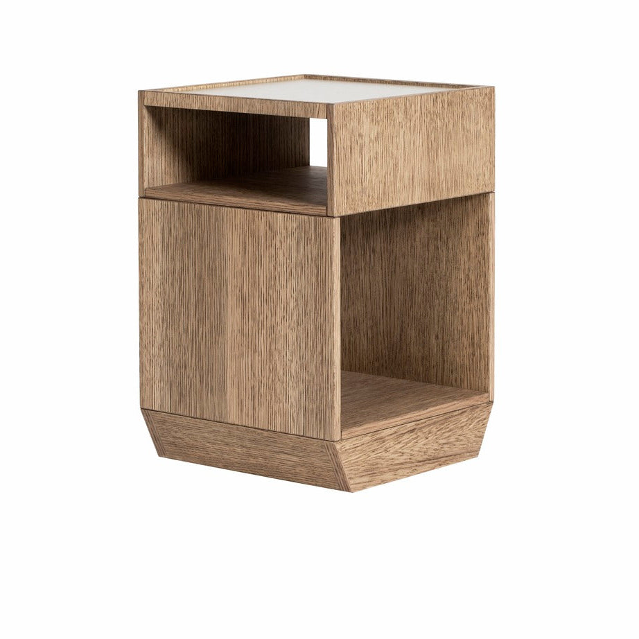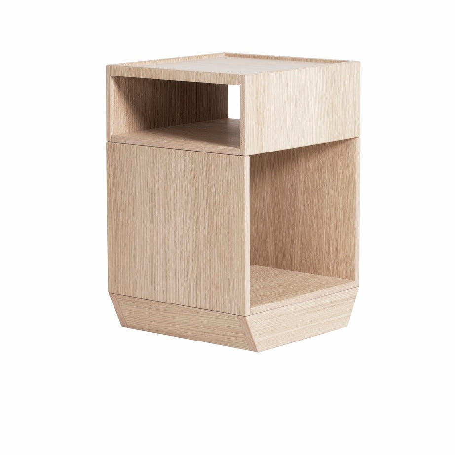 Pile is a small storage unit in oak veneer with hidden wheels. Perfect as combined book table and storage cabinet, a small nightstand or sofa table.