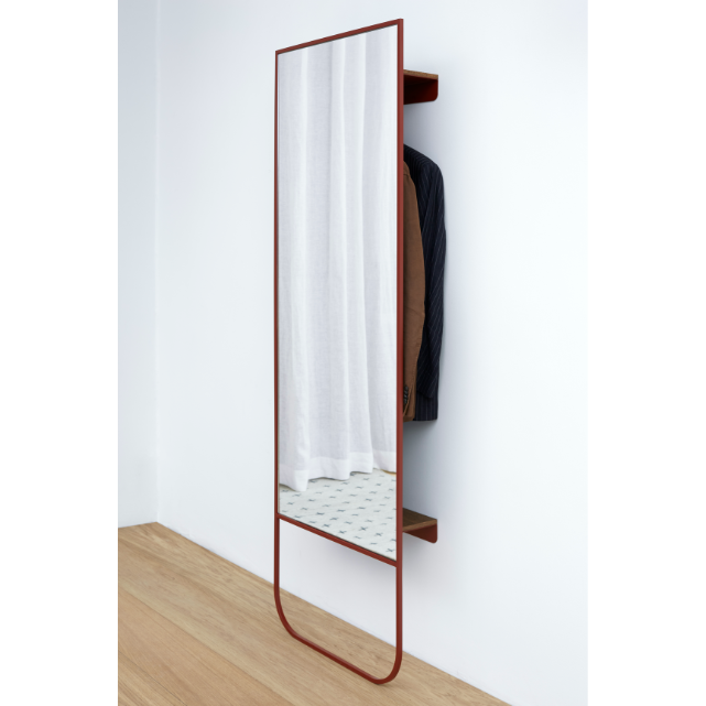 Tati H conceals a practical clothes hanger. Perfect for narrow entrances, offices, and hotel rooms, it offers a space-saving and sophisticated hanging solution for your clothes. Wall-mounted hotel mirror for private or public spaces.