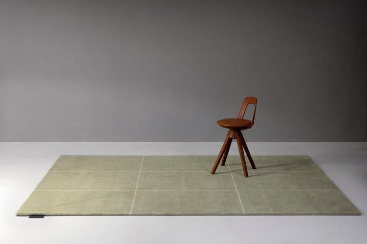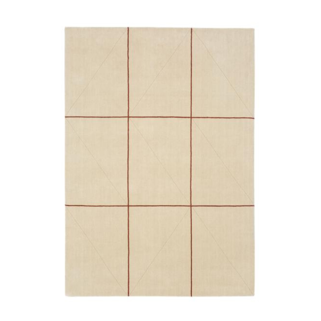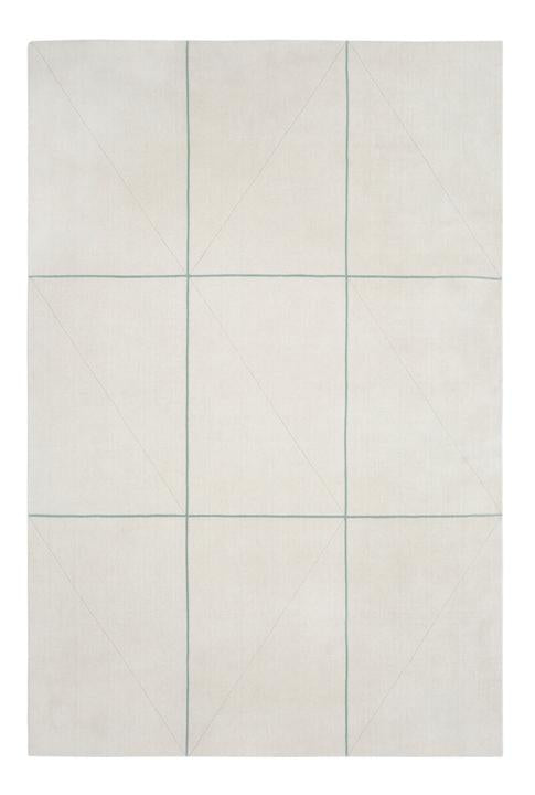 Handloom carpet featuring an oversized grid pattern with subtle hand-cut diagonal wedges. Made of 100% wool, this rug is soft and has a natural luster. It is a high-quality, thin yet luxuriously soft and durable knit woven rug.